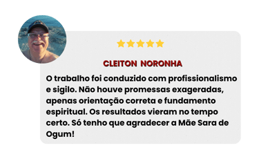 Com Mãe Sara de Ogum, a limpeza espiritual é realizada com fundamento, seriedade e responsabilidade. Cada trabalho é precedido de análise espiritual, garantindo que o ritual seja direcionado corretamente e realizado de acordo com a real necessidade de cada pessoa.