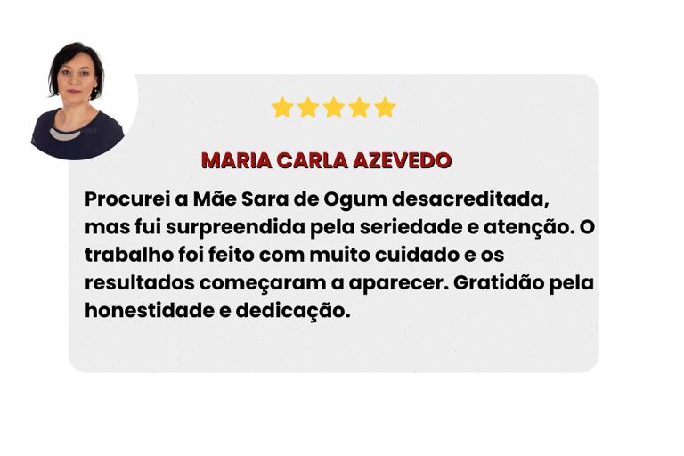 Mãe Sara de Ogum é uma sacerdotisa espiritual reconhecida por sua seriedade, experiência e compromisso com a verdade espiritual. Seu trabalho é guiado pela força, justiça e proteção de Ogum, orixá que rege os caminhos, as batalhas vencidas e a quebra de demandas espirituais.